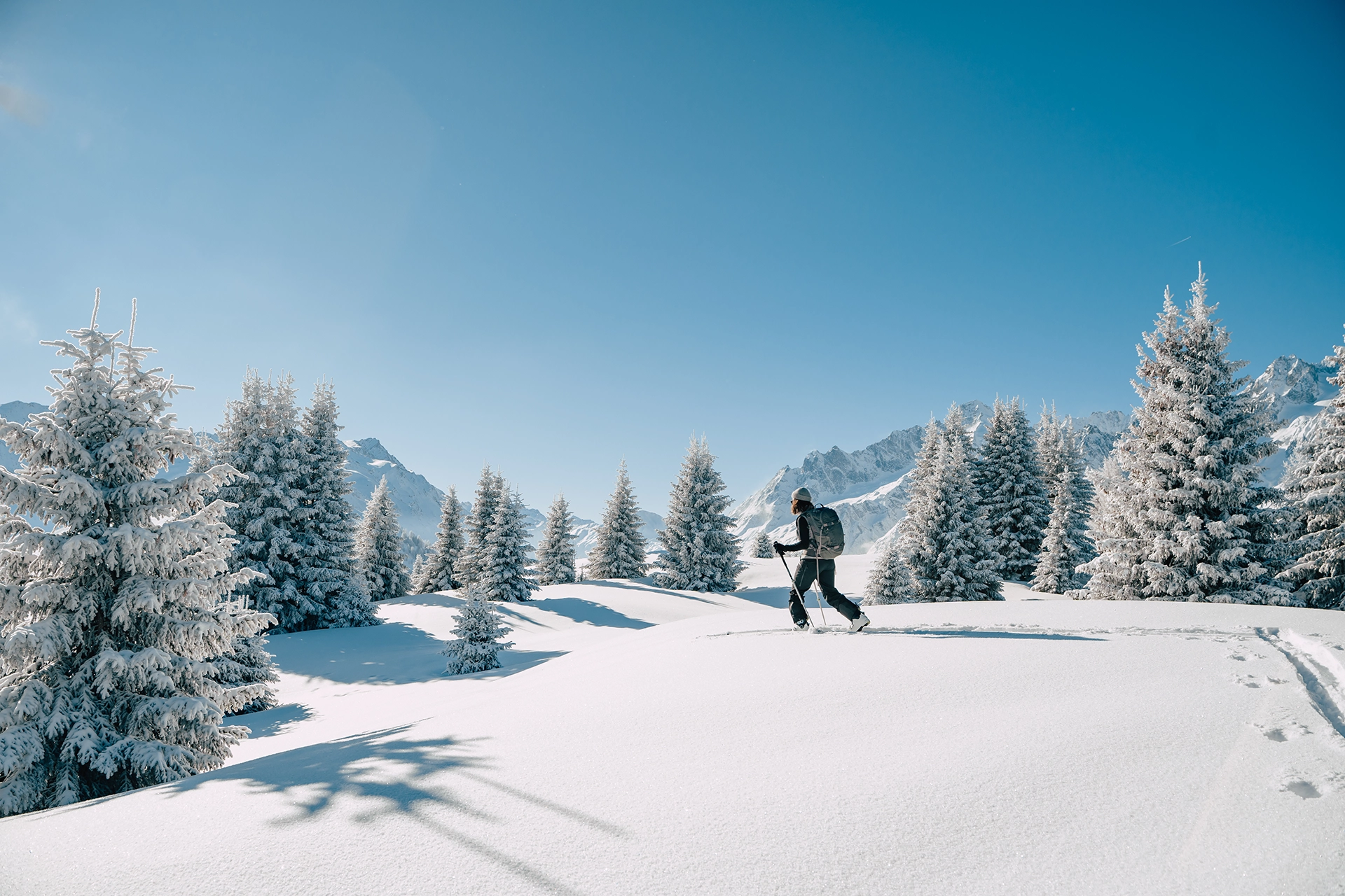 This is the perfect option for a gentle introduction. From Tignousa, follow the Chemin des Planètes trail before branching off onto the snowy road leading to Hôtel Weisshorn.